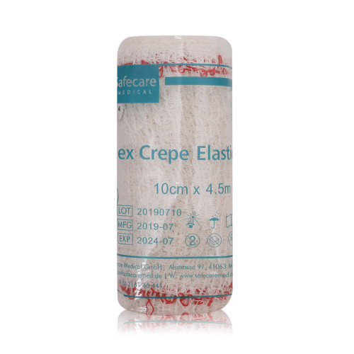 Prime crepe bandage 10Cmx4.5M - consists of characteristics fabric of plain weave in which warp threads are two fold cotton threads, crepe twisted and weft threads are of cotton/Viscose/Both mixed. The warp threads are arranged two threads s twist and two threads z twist repeated. It is one continuous length without joints and has fast edges. Cotton crepe bandage is used for sprains, and strains and in other conditions in which light support is required.