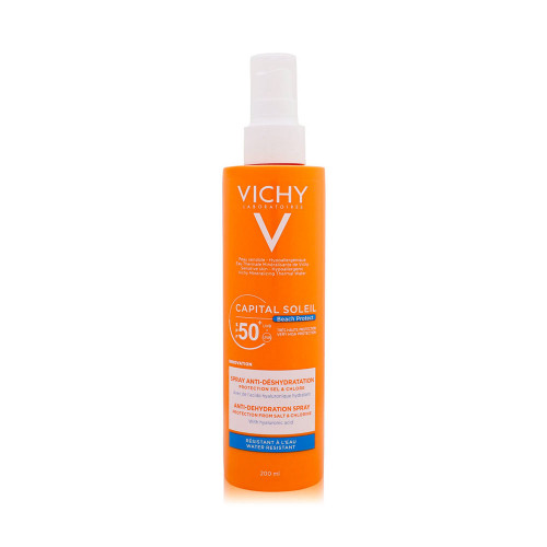 Vichy Capital soleil beach protect Anti-Dehydration spray spf 50+ 200Ml Is a care dedicated to all skin types, even the most sensitive ones to protect them from sun, salt and chlorine. It contains moisturizing hyaluronic acid. It is resistant to water.