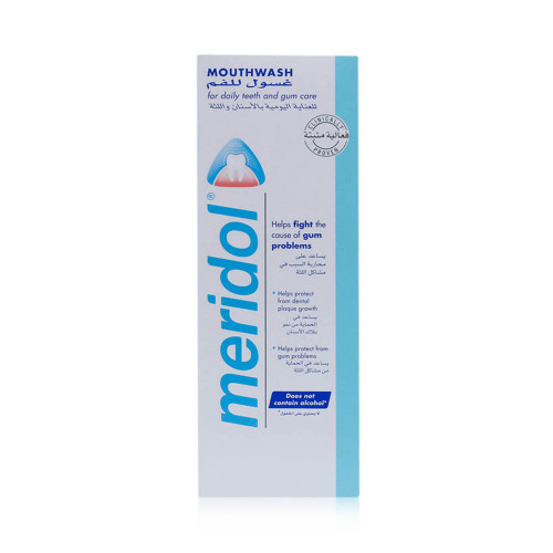 Meridol mouth wash 400Ml -Meridol mouthwash 400Ml is an alcohol-Free, ready-To-Use solution for the daily care of the gums and teeth. This mouthwash fights the main cause of gums irritation: bacteria located on the gumline. Soothing, this mouthwash works effectively to keep teeth and gums clean and healthy. This mouthwash helps to prevent gum irritation, occasional gingival bleeding, plaque formation and decays. Its bi-Active formula provides immediate and lasting antibacterial efficacy. Contains: amine fluoride (Olafluor), tin fluoride.