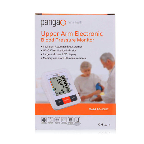 Pangao 800B31 upper arm: fully automatic measurement with Oscillometric method. * Who blood pressure classification indicator and Irregular heart rate detection. *Extra Large, Easy-To-Read lcd display With white or White Back-Light. (Lcd size: 63*82Mm). * live voice talking system with multi-Language in one device or single language For choice . * ( English,  Spanish,  Portuguese, german, french, Italian, greek, farsi, turkish,  Russian, Arabic, thai, vietnamese  And Multi-Language  Are  Available). * Clear Button and One-Touch operation for easy use. * 90 or 120 memories. * date and time Stamp. * Kpa / mmhg unit Exchanged. * automatic Switch-Off Function To save power. * approval: iso:13485: 2003,Ce0413, fda510K, Rohs, emc,Lvd. * power supply :Ac adapter (Ce,Ul) + batteries (4Aa*1.5V). * change battery indicator To replace battery. * warning Of operating errors. *Two User type or single user type for choice. * Average reading of latest three measurement result.