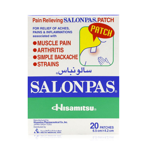 The strength of salonpas pain relieving patch has been improved with more medicine than the salonpas original. Salonpas pain relieving patch has three active ingredients in a more flexible, 20% larger and easy to apply patch. Salonpas pain relieving patch provides temporary relief of minor aches & pains of muscles & joints associated with arthritis, simple backache, strains, bruises, sprains