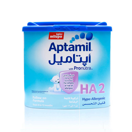 Aptamil HA 2 is a hypoallergenic follow-on formula designed for babies aged 6–12 months who are at risk of developing allergies. With partially hydrolyzed protein, it is easier to digest and less allergenic, helping to reduce the risk of allergic reactions. Enriched with DHA, iron, vitamins, minerals, and prebiotics, it provides tailored nutrition to support your baby’s growth, brain development, and immunity during the weaning stage.
